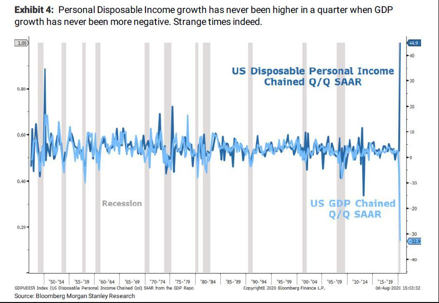摩根士丹利首席美股策略师MichaelWilson表示,尽管现在依然身处前所未有的深度衰退中,但二季度美国个人可支配收入增速创下新高。让人感到不寻常的不只是这种分化现象,更是其程度之深。这是美国政府大规模财政刺激带来的直接结果,从下图来看,财政刺激计划效果超预期地实现了目标。