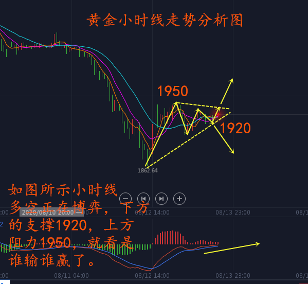 1、日线以震荡十字K报收,在经历前一日放量大跌后昨日整体处于震荡修复为主,1900下方短线支撑较强,4小时技术图形在1860-1880区域出现明显底背离形态,今日价格有望依托1900关口继续迎来震荡修复,下方短线支撑关注1904一线,上方压力1945-1950区域,日内依托此区间布局多空即可,中间位置多看少动,短线承压1953下方依旧震荡偏空对待。如上图走势解析图所示,综合来看,黄金今日短线操作思路上李善策个人建议以回调做多为主,反弹高空为辅,上方短期重点关注1953一线阻力,下方短期重点关注1903一线支撑。小时线看目前是处于三角震荡,短期是涨势跌,三角震荡是否会被打破,如下图所示。