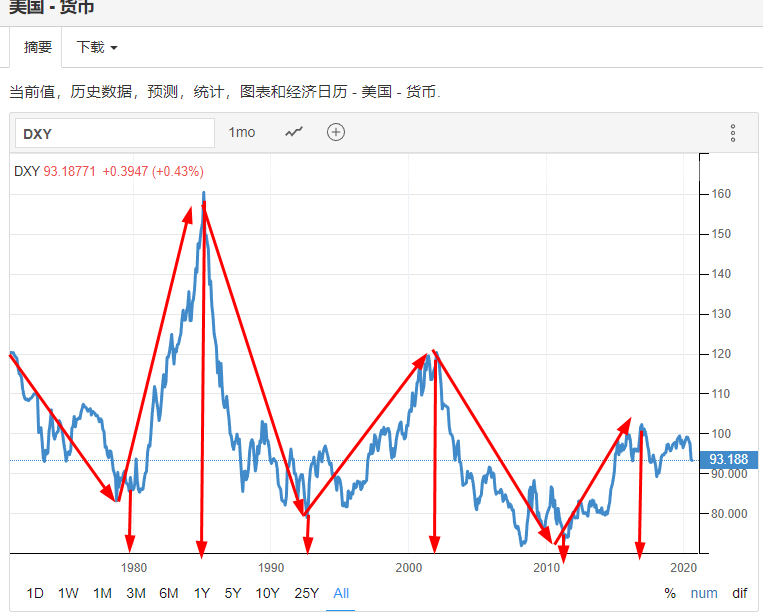从美元的历史数据看,美元呈现明显的周期性,几年走强,几年走弱,而这正是美元收割世界财富的工具,这不是本文的重点,本文只是想表达美元的周期性与黄金的关系,我们只要知道美元具备周期性就可以,而现在美元又进入了弱美元时代,也就是说,美元贬值时代开启了。