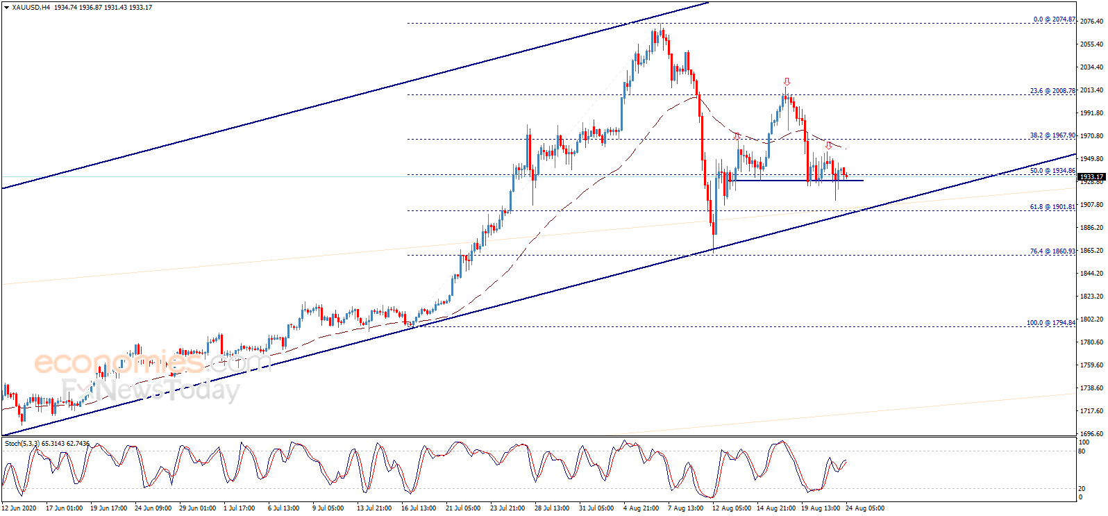 金价继续在1934.86美元/盎司附近波动,金价面临持续的负面压力,仔细观察走势图,我们发现金价走势形成头肩顶形态,目标瞄准主要看涨通道支撑线,一旦失守这一水平,这可能导致金价短期趋势转为下跌。