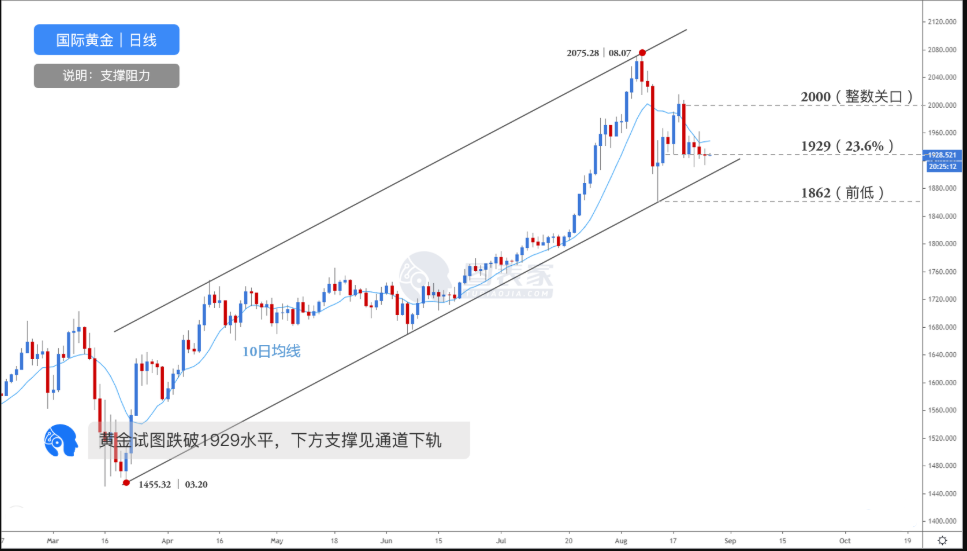 图为黄金日线走势,价格在近几天横盘震荡,维持在10日均线之下,且多次测试斐波那契23.6%回调位1929附近支撑。目前价格正试图跌破1929水平,若价格成功破位,则进一步支撑见通道下轨,接着是前低1862.
