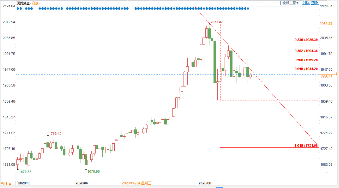 短时间黄金依然承压于下降趋势线下方,上方关注2075.74/1863.16的61.8%分位于1944.20美元,日内若收于这一线上方,预计很快将重新测试8月27日高点1976.64美元的压力。