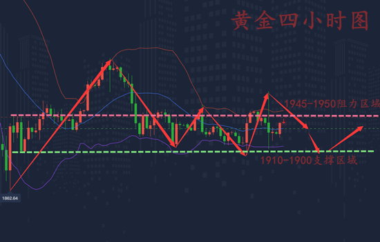 从四小时各项指标来看,当前布林带呈平口期,K线昨日刺破下轨后立马回升至中轨附近震荡运行,MA均线双双结为死叉,KDJ随机指标三线平稳向前,MACD红色动能柱持续放量,快慢线向上扬起,综合来看,日内黄金或将有所回升,但总体趋势上还是看空,操作上白盘以高空为主,晚间回踩支撑不破再多。上方关注1945阻力区域,反弹至此区域直接空!下方关注1910-1900支撑。