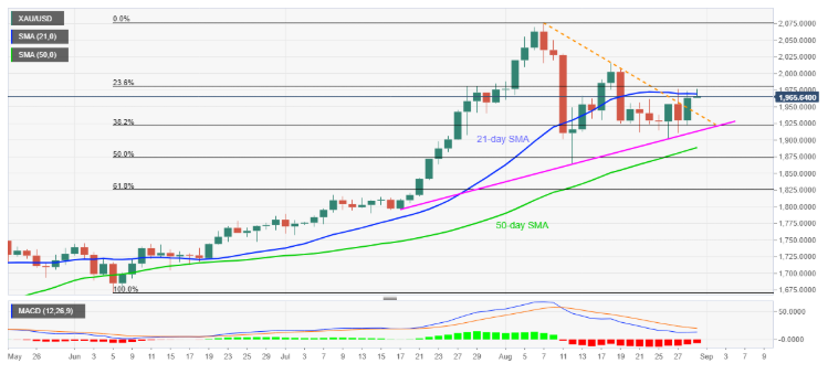 周一欧洲时段开盘时,黄金/美元价格回落至每盎司1,968.50美元,日内上涨0.28%。金价自21日SMA回落,即便维持上周五对8月7日以来下降趋势线的突破。
