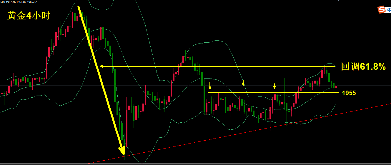 从4小时图上看,昨日金价突破了1975上周阻力,一度拉升至1993一线受阻,该位置处于2075~1863范围的反弹61.8%价格,欧盘持续上攻未能突破,美盘由于美元指数走出AB等于CD形态,美元指数在D点止跌反转,黄金则由涨转跌,再次突破1975回落至1960附近。