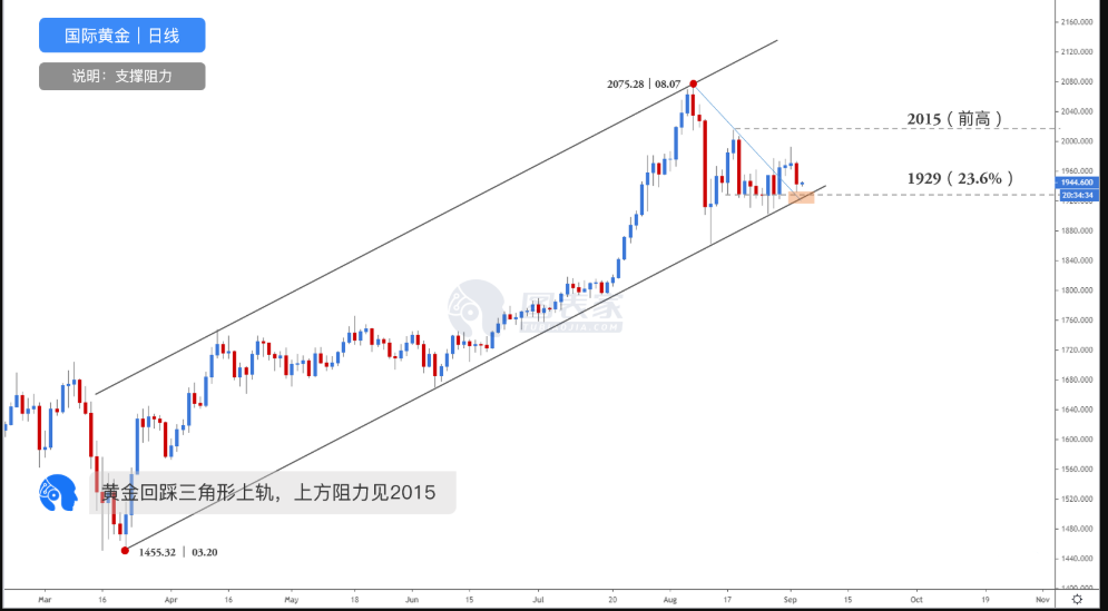 黄金日线走势,价格突破三角形上轨后回落,测试三角形上轨附近支撑。若价格守住该支撑反弹,则意味着三角形态确认破位,上方阻力见2000关口,接着是前高2015.