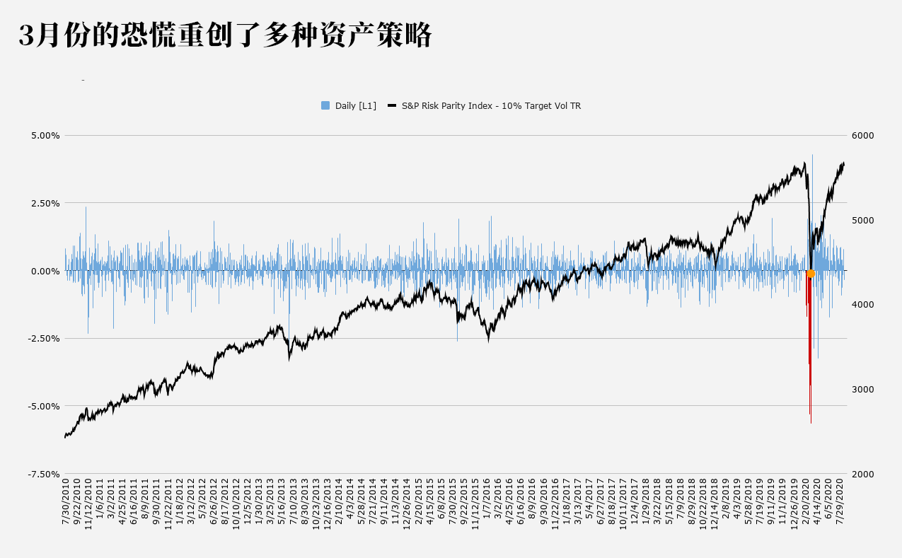 例如在3月份的恐慌中,投资者第一次真正看到了风险平价去杠杆时会发生什么。随着全球争相筹集美元现金,美债和股票一起遭到抛售,对多种资产组合造成严重破坏,连黄金也不例外。最后迫使美联储介入。