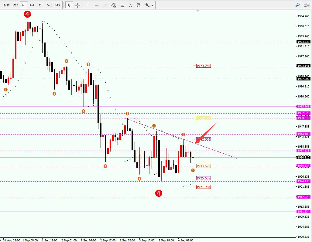 黄金4小时收线后,价格一波下探至1930.63后出现反弹。这几日4小时走势都是呈现一根阴柱后一个十字星,在来一根阳柱。之后价格再次收阴后再次十字星加阳柱。基本是重复走势。而4小时也呈现收敛三角区间震荡,所以今日晚间非农将会出现方向。