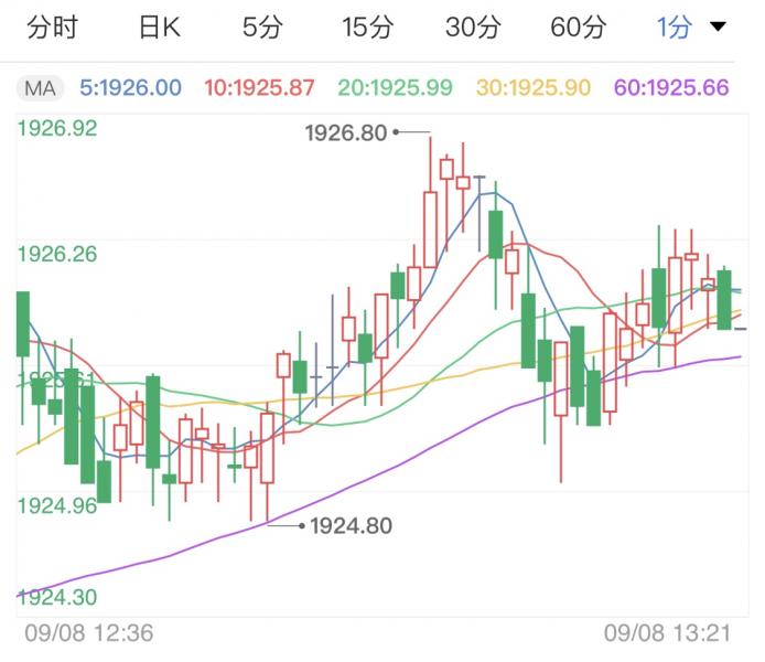 周二(9月8日),黄金目前短线企稳于1930美元/盎司以下震荡,金价延续区间内小幅回调走势,目前黄金暂报1927.70美元/盎司。