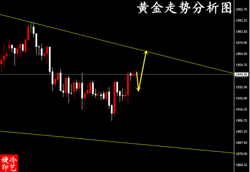 目前4小时伴随阳夹阴K线的旗形整理上扬。小阴线回撤,大阳线上升。拉动短期均线拐头向下,昨日回测后启稳在1940上方整理,今日强势的话,会在1948附近整理再次延续上涨。小时图则伴随小台阶上涨格调,昨日低点1920是今日多头临界点,预计明天周线收官会在阻力处承压回落。