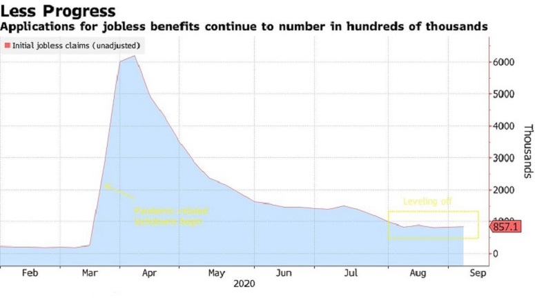 美国每周初请失业金人数依然超过80万。9月10日的报道暗示,美国国会为失业人士和企业提供额外支持的机会减少。今年8月份,特朗普总统授权额外失业补助,但也即将用完,但瘦身版的刺激计划却没有得到参议院通过。