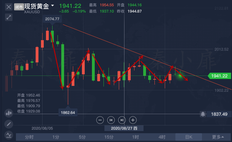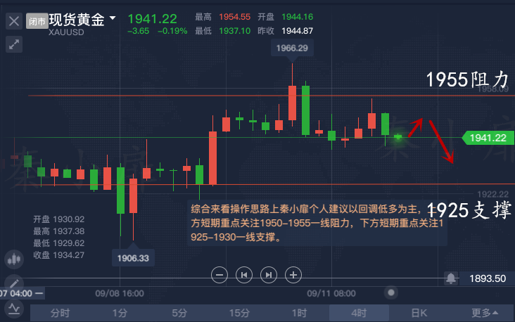 四小时级别来看,布林带初步开口,金价逼近布林带上轨;MACD金叉、红柱动能有所增加,KDJ金叉、指数位于80附近。从技术面看,黄金短线走势偏震荡上行。秦小扉认为上行方面先留意布林带上轨1950.87;进一步阻力位上看8月27日高点1976.64。强阻力上看前高1992.48,若上破将重新测试2000美元关口。下方初步支撑先留意布林带中轨,进一步支撑看向下轨1916.32。强支撑下看8月26日低点1902.89,此外本周低点1906.72投资者也可简单留意。综合来看操作思路上秦小扉个人建议以回调低多为主,上方短期重点关注1950-1955一线阻力,下方短期重点关注1925-1930一线支撑。