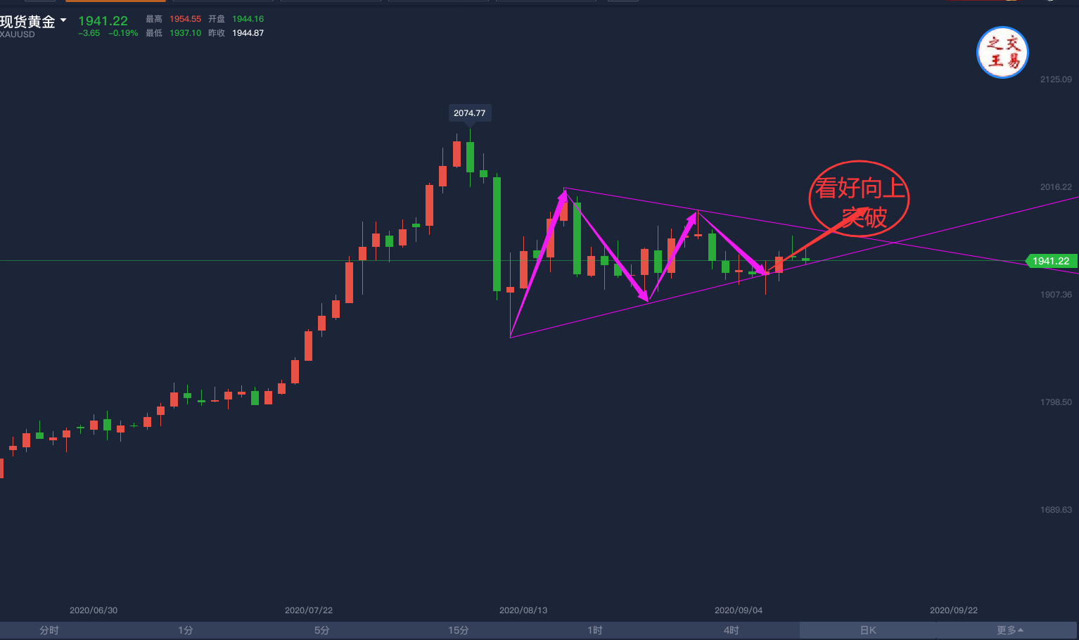 目前三角收敛形态明显,强烈暗示一旦突破当前的盘整区间,金价将迎来破位行情!