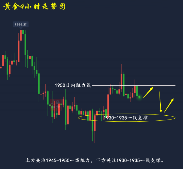 黄金技术面来分析,日线上看,周五黄金再度上演探底回升,冲高回落,盘中由涨转跌,录得带上下影线的小阴,日线上,由于并未有效企稳中轨20日线,持于受*连续两日收于下方,下周或将继续冲高回落下跌;4小时上看,周五黄金持于中上轨之间运行,盘中涨跌转换,当前布林带有收口迹象,MA均线走出死叉向前延伸,KDJ随机指标三线向下,到达超卖,MACD指标绿色动能柱开始出现,快慢线即将死叉向下,综合来看,黄金目前技术面面临超卖,短期内或将有反弹需求,但仍有下行风险,下周一操作建议反弹做空为主,回撤做多为辅,上方关注1945-1950一线阻力,下方关注1930-1935一线支撑。