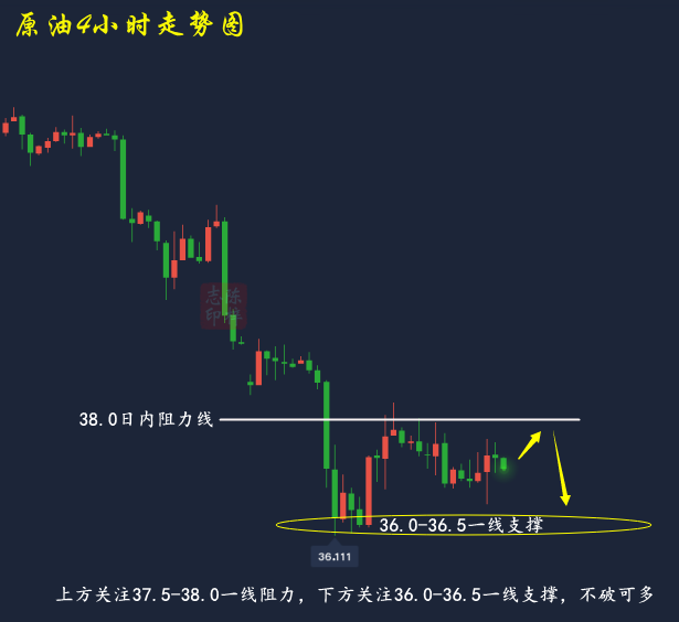 原油技术面来分析,日线上看,周五原油先跌后涨,随后触及日内高位受5日均线*呼呼罗,收得带上下影线的中阳,日线上,或将继续探底回升冲高回落;4小时上看,周五原油位于中轨附近徘徊,盘中涨跌转换,多次上至中轨20日线上方后会做,当前布林带处于收口期,MA均线三线向前,KDJ随机指标微微向下弯钩,KDJ随机指标红色动能柱开始缩量,快慢线平行向前,综合来看,原油由于需求担忧,同时库存较多承压,下周一仍有下行趋势,操作上建议反弹做空为主,上方关注37.5-38.0一线阻力,下方关注36.0-36.5一线支撑,不破可进行多单博弈。
