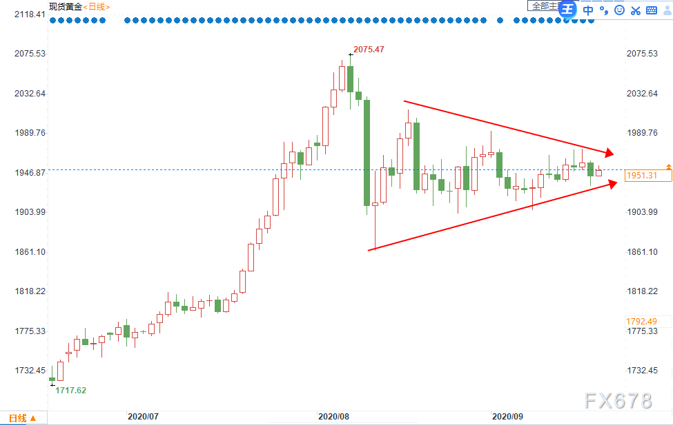 周五(9月18日)现货黄金小幅反弹,现报1951.58美元,涨幅0.36%。
