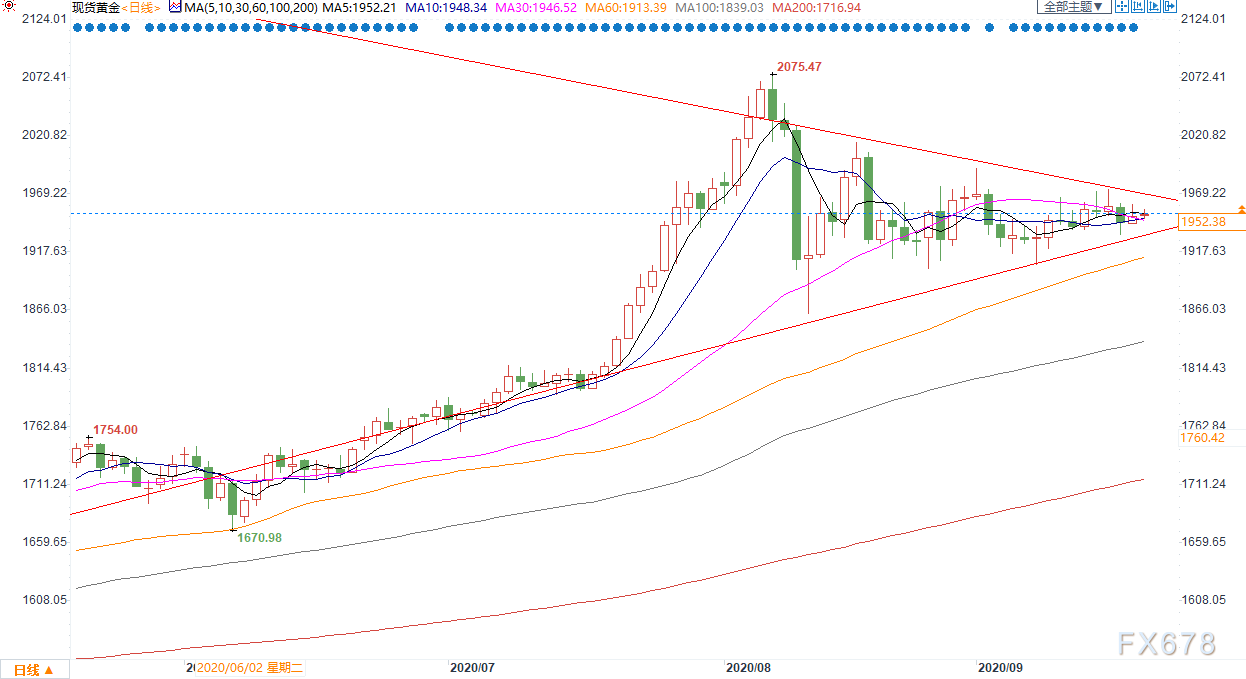 周一(9月21日)现货黄金围绕着1950美元窄幅震荡,现报1951.70美元,涨幅0.04%。