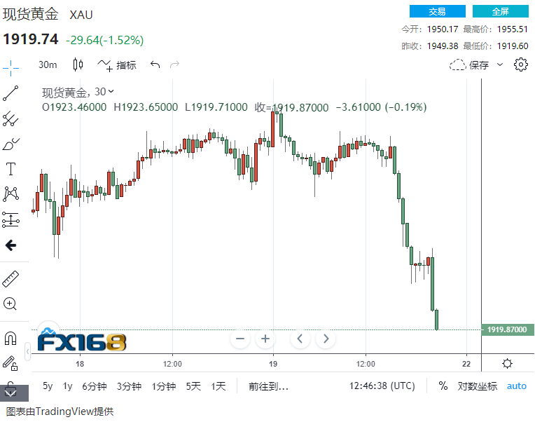 周一(9月21日)欧市盘中,现货黄金维持跌势,最低跌至.60美元/盎司,最多暴跌超30美元。现货白银跌破26美元/盎司,日内跌2.7%,创近两周新低。。COMEX期银跌3%,现报26.27美元/盎司。COMEX期金跌近1.7%至1929.3美元/盎司。