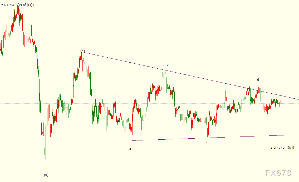 现货黄金处于自1974美元开启的下行e浪中,下方支撑位看到1920美元附近。e浪是自2015美元开启的调整(c)浪的子浪,(c)浪则隶属于自2075美元开启的下行((iv))浪。