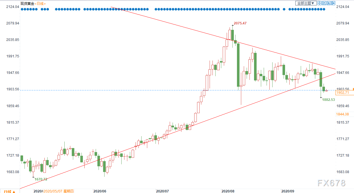总体而言,美元的走强是黄金失守1900美元关口的主要因素。部分分析师认为,随着美国进一步刺激方案的达成遥遥无期,且黄金失守了关键的支撑位,短时间黄金存在进一步回落的空间。