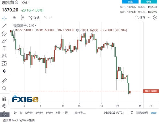 周三(9月23日)欧市早盘,现货黄金延续此前的跌势,最低下挫至1872.99美元/盎司,日内最多暴跌超30美元,且距离前期低位1862水平仅有10美元。分析认为,金价下挫,应该是受到美元持续上攻所打压。