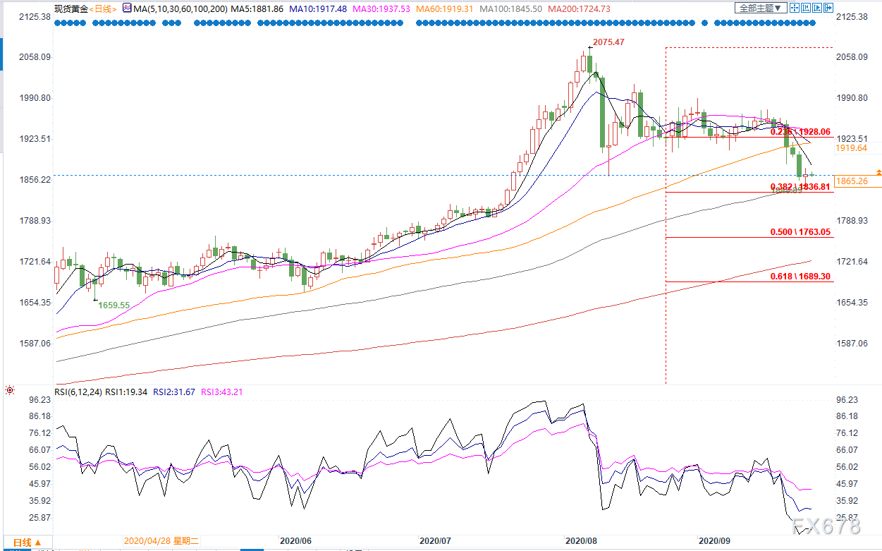 周五(9月25日)现货黄金小幅震荡走低,现报1864.88美元,跌幅0.17%。