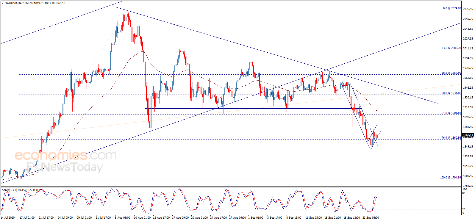 Economies.com在文章中写道,金价昨日收盘位于1860.90美元/盎司上方,这暗示金价试图止住主导近期交易的看空压力。但我们注意到,随机指标目前传递负面信号,此外,从4小时图来看,EMA 50指标对金价施压。