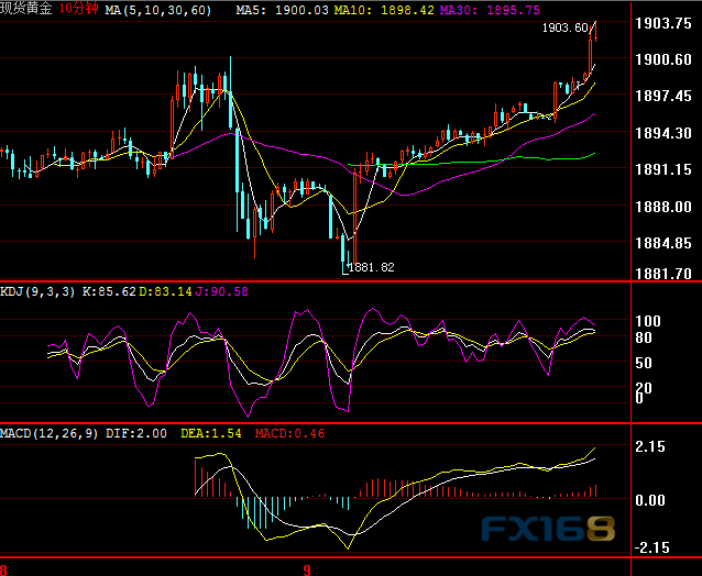 周五亚市盘中,现货黄金短线快速拉升,并一举攻克1900美元/盎司大关,最高触及1903.60美元/盎司。