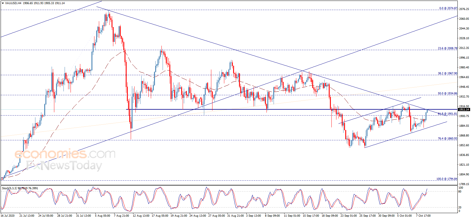 周五(10月9日)亚市尾盘,现货黄金维持升势,金价现报1909美元/盎司附近。知名财经资讯网站Economies.com周五最新撰文,对日内欧元/美元、英镑/美元、美元/日元和黄金走势进行前瞻分析。