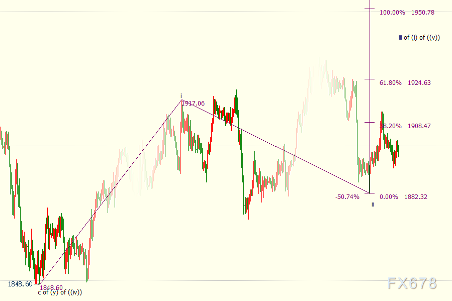 小时图上看,金价自1917美元开启的调整ii浪走势出现延展。若金价在1882美元结束ii浪、并开启iii浪走势,金价有望升破1898美元,它是iii浪的23.6%目标位,上方阻力看向50%目标位1917美元和61.8%目标位1925美元。