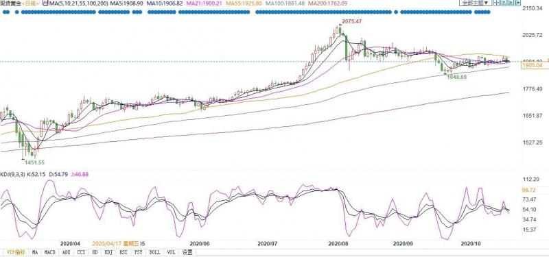 因美国大选前出台新冠援助计划的希望减弱,10月22日现货黄金一度跌至1894.74美元,最后收跌1.05%,报1904.11美元,进入10月23日持续弱势震荡。