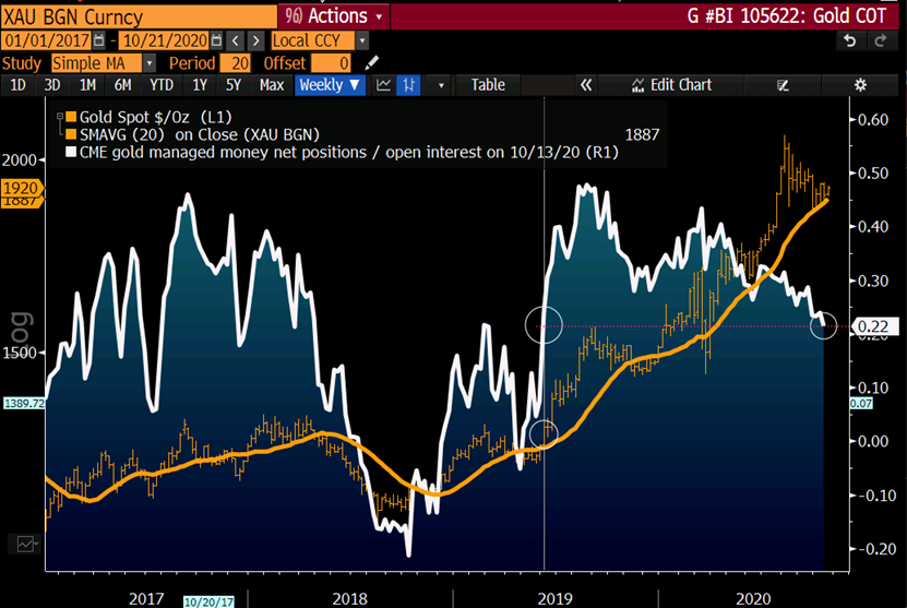 黄金期货多头头寸降至年内最低水平,这是积极的,因为当管理资金在牛市中做多或在熊市中做空时,头寸可能是极端和过度的。