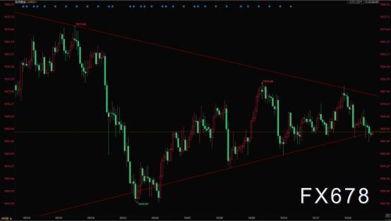 从现货黄金4小时图来看,黄金价格近期震荡区间不断收窄,目前运行在震荡区间的下轨线附近,或将选择方向。