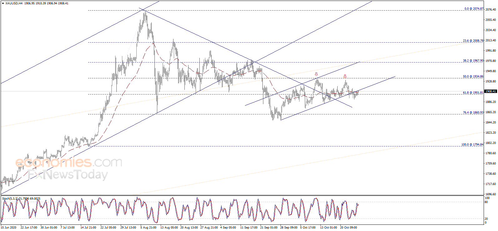 周二(10月27日)亚市盘中,现货黄金维持升势,金价现报1908美元/盎司附近。知名财经资讯网站Economies.com周二最新撰文,对日内黄金走势进行前瞻分析。