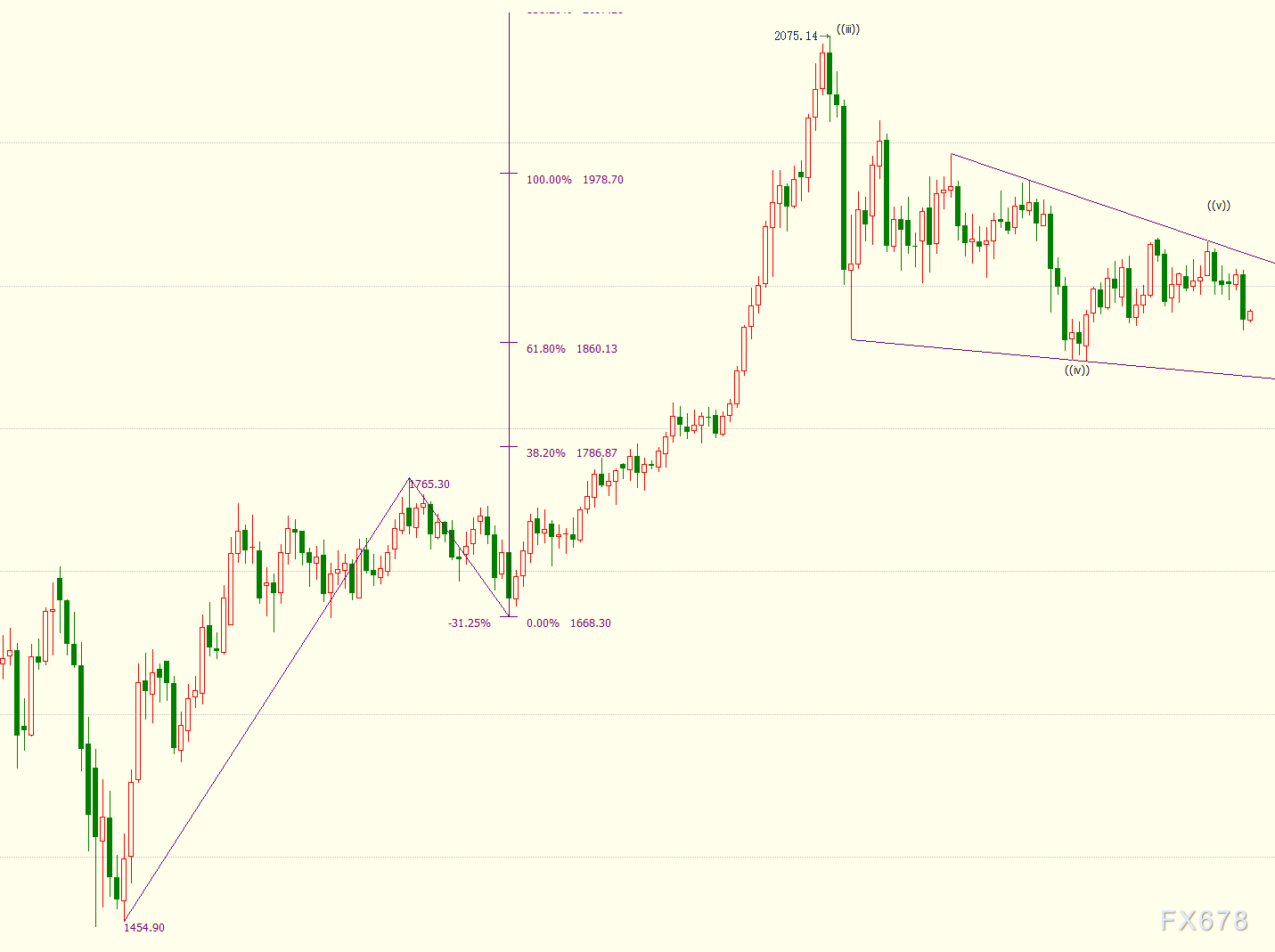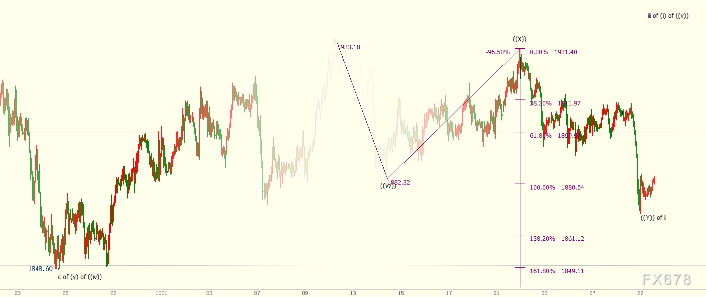 小时图上看,金价自1931美元开启的((Y))浪走势在138.2%目标位1869美元附近止跌。((Y))浪是自1933美元开启的调整ii浪的子浪。ii浪呈现((W))、((X))、((Y))三子浪模式,是自1849美元开启的上行(i)浪的子浪。