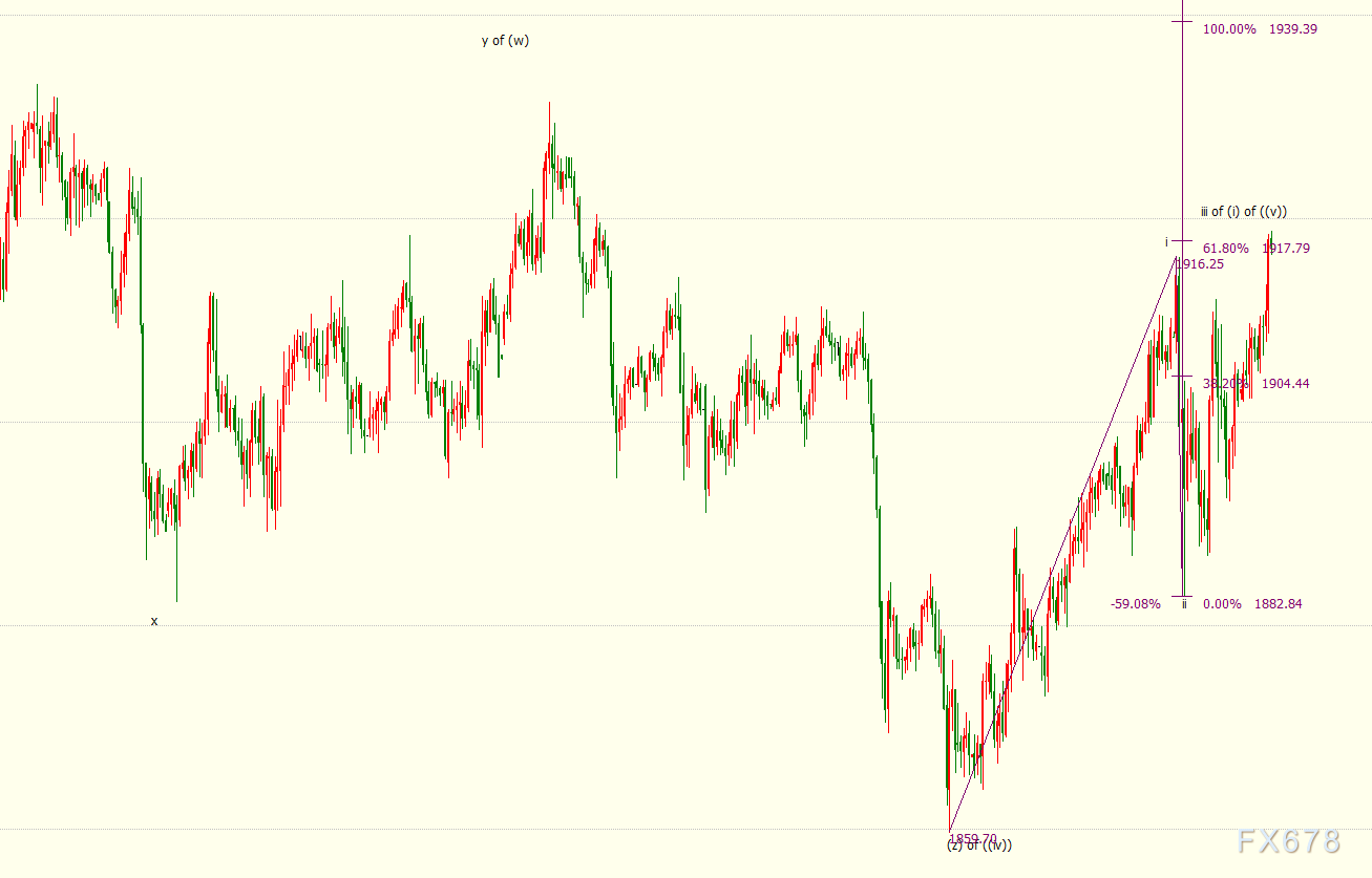 金价在1860美元开启上行((v))浪走势,目前处于其中的(i)子浪。(i)浪又可细分为五个二级子浪。若金价自1883美元开启上行(iii)浪走势,100%目标位看向1939美元。日线图上看,((iv))浪和((v))浪都是自1455美元开启的上行3浪的子浪。