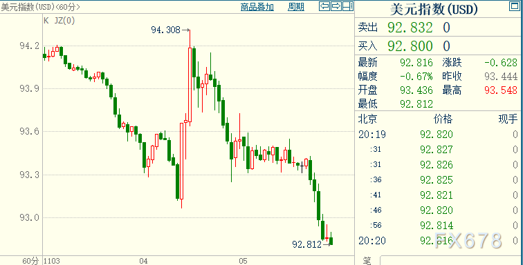 随着美国大选进入最后揭晓阶段,投资者解除一些美元多头,美指录得10月27日以来新低至92.812。分析师称,对于拜登胜选将采取更温和贸易政策的预期,可能会削弱美元兑主要贸易伙伴国的汇率,并预计拜登将支持更大规模的新冠病毒肺炎救助计划,进而支撑金价。