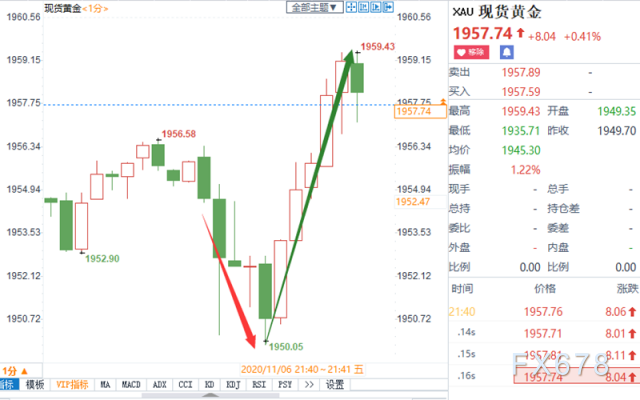 北京时间周五(11月6日),美国劳工部发布10月非农就业报告,失业率连续六个月下降;新增就业人数好于预期,但不及前值,增幅连续四个月下降。截至发稿,现货黄金下挫4.6美元后反弹9.4美元至1959.43美元/盎司;美指上扬8点后下挫近14点至92.268。