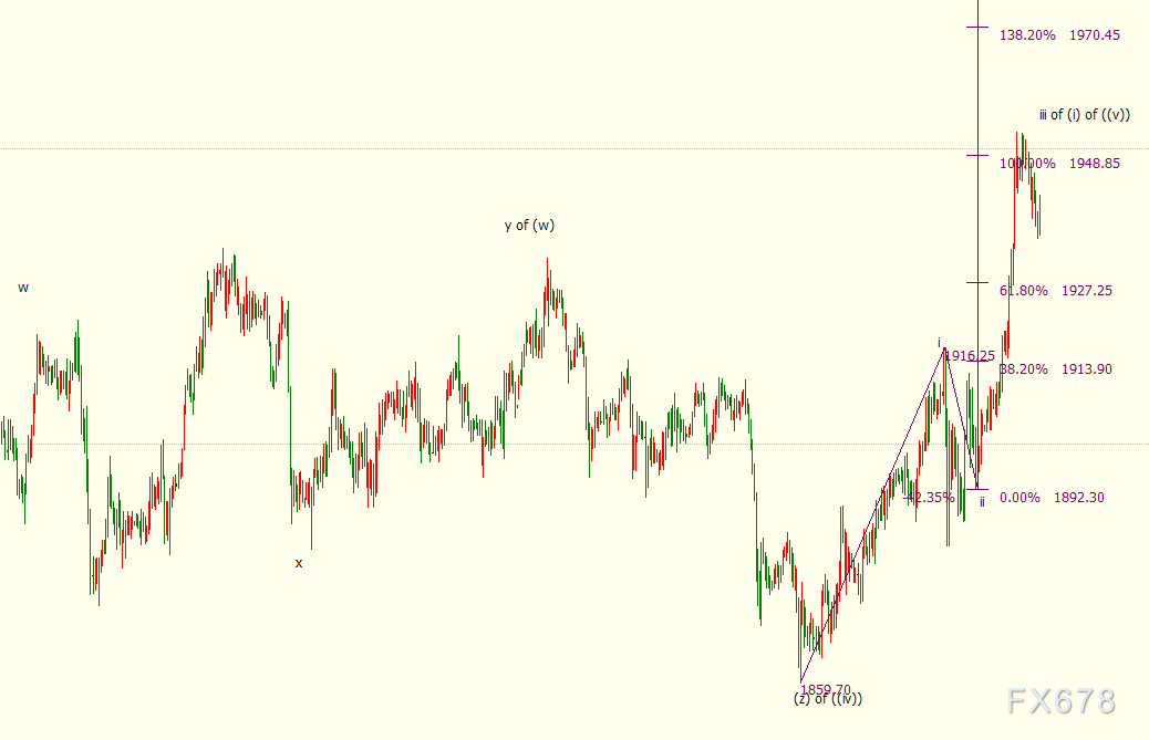 金价自1892美元开启上行iii浪走势,已升破100%目标位1949美元,下一道阻力位上看138.2%目标位1970美元。iii浪是自1860美元开启的上行(i)浪的子浪,(i)浪隶属于同样自此开启的上行((v))浪的子浪。日线图上看,((v))浪都是自1455美元开启的上行3浪的子浪。