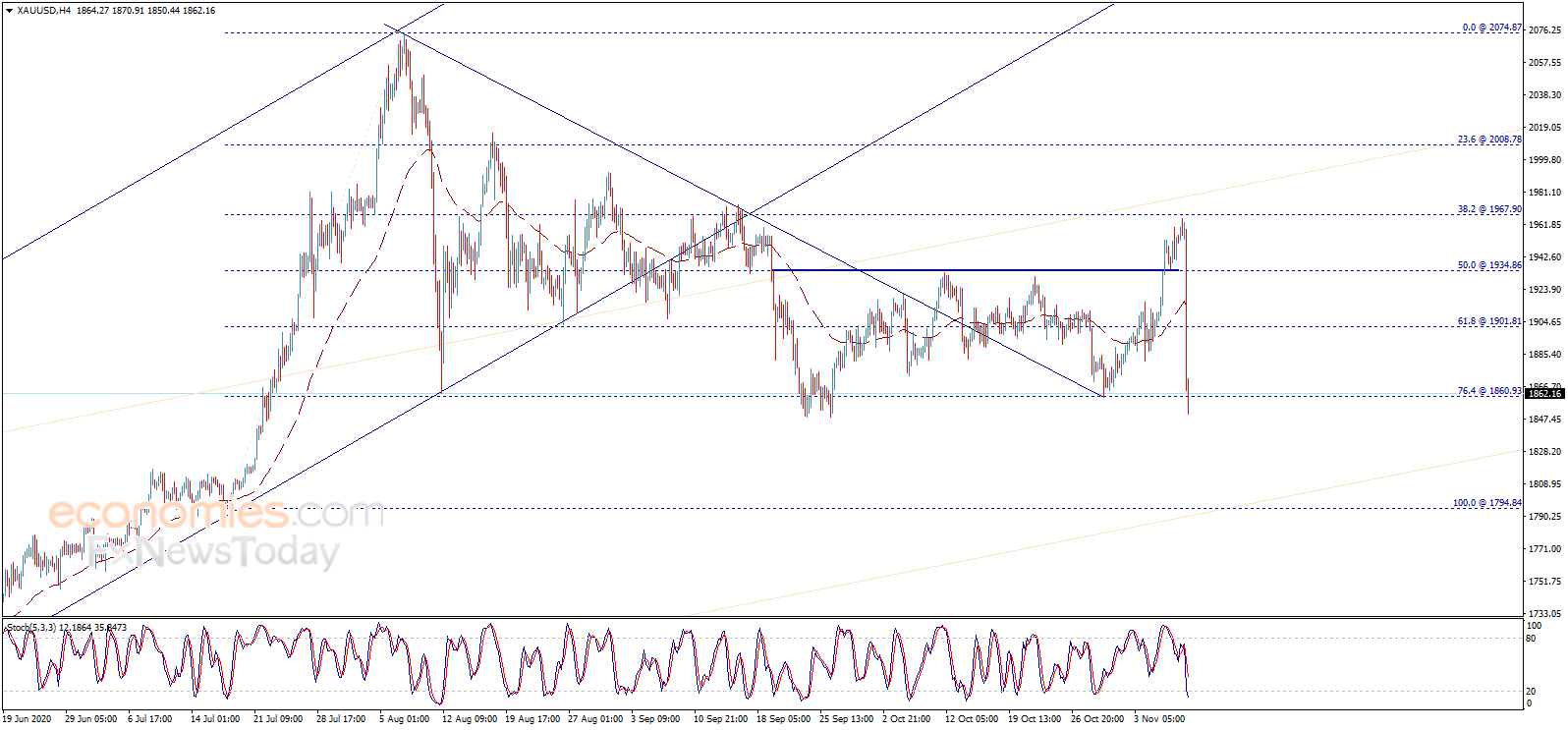 Economies.com指出,若金价确认跌破1860.90美元/盎司水平,这将推动金价跌向下一看空目标1794.84美元/盎司。