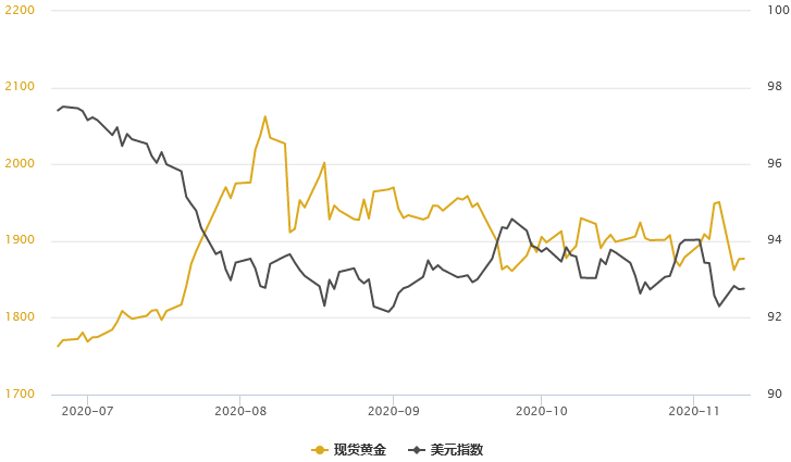 周三(11月11日)现货黄金回到1880美元/盎司下方,全天整体窄幅震荡,国内贵金属T+D普遍走低,市场风险偏好情绪回暖对黄金不利,因无息黄金的机会成本不断上升,美元走高,而10年期美债收益率升至今年3月20日以来的近八个月新高0.975%,这令黄金承压。