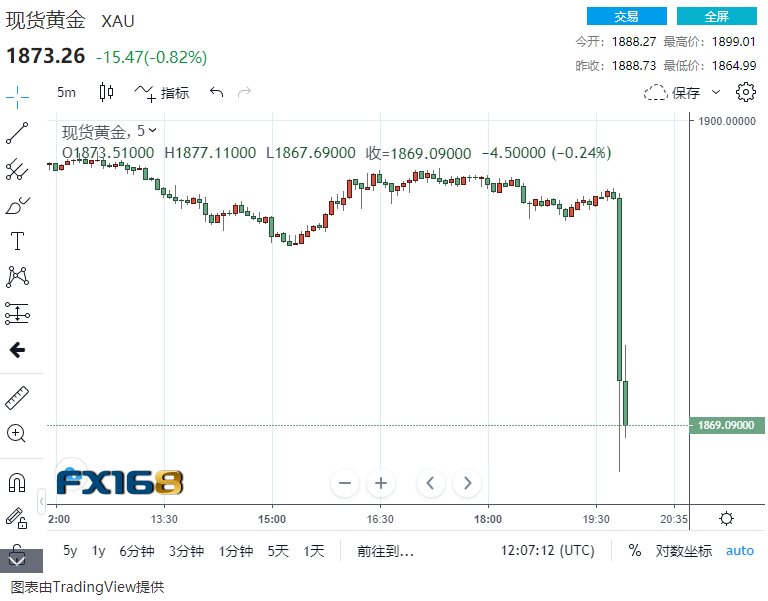 在风险情绪爆发之际,金价遭遇“闪崩”,短线一度暴跌近30美元,最低1865.44美元/盎司。有数据显示,COMEX最活跃黄金期货合约在北京时间19:53-19:54两分钟内成交量为8519手,交易合约总价值超近16亿美元。