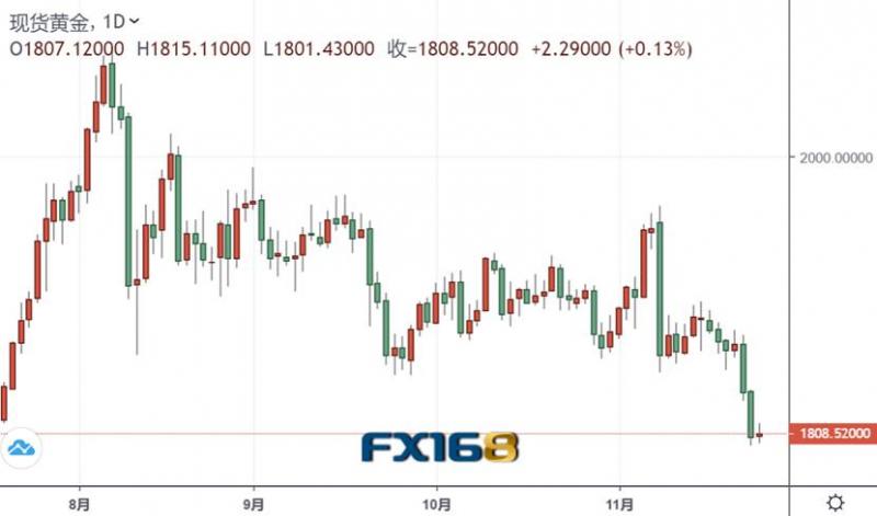周三欧市盘中,随着市场开始盘整寻找下一催化剂,加上感恩节假期逼近,金价跌势得以喘息,目前重返1810美元上方,此前一度逼近1800关口。