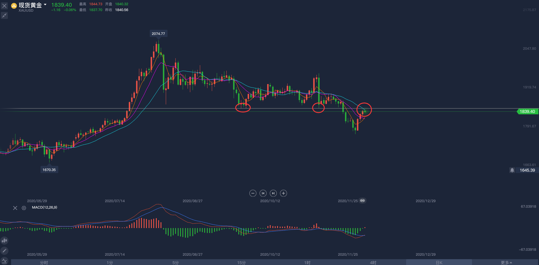 我手中持有的单子是刚进的1843空,和昨天一样,1852作为防守,我依然看空黄金。一小时图中的MACD顶背离也预示着会有一波下跌,日线图中,黄金到位20日均线压制,1848是最重要的压力位,如果你不知道为什么,打开日线图,看看9月24日、25日、28日和11月9日的低点。