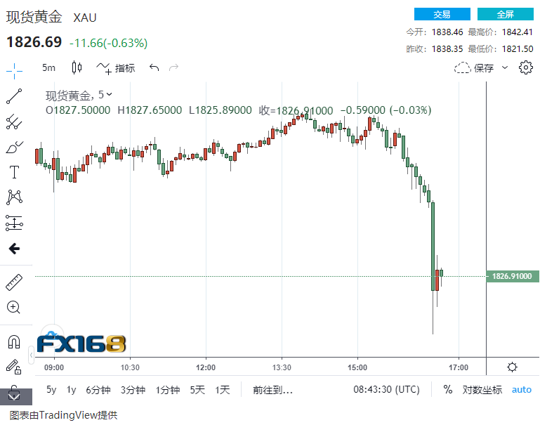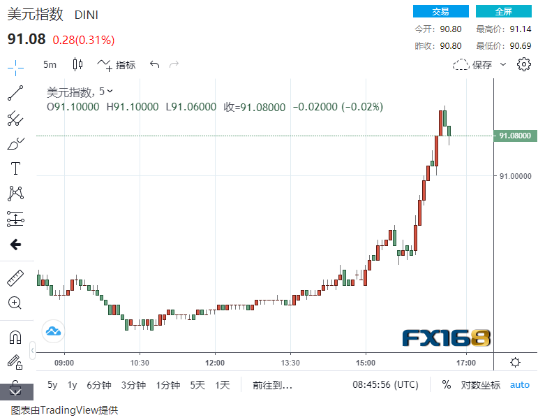 由于欧元、英镑遭遇下挫,美元趁机反弹,冲破91关口,最高91.14。现货黄金也遭遇了短线大跌,最低跌至1821.50美元/盎司,最多暴跌超20美元,现货白银跌超2%,最低23.521美元/盎司。