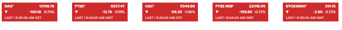 欧洲股市:欧洲股市主要股指今天全线低开,且在早盘扩大跌幅,似乎也是受到脱欧消息冲击。截至发稿,欧洲股市主要股市跌幅一度扩大至逾1%,法国CAC40指数跌1.25%,欧洲斯托克50指数跌超1%,德国DAX指数跌近1%。