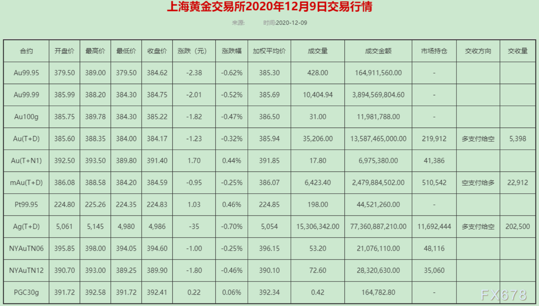 上海黄金交易所2020年12月9日交易行情,黄金T+D成交量35.206吨;