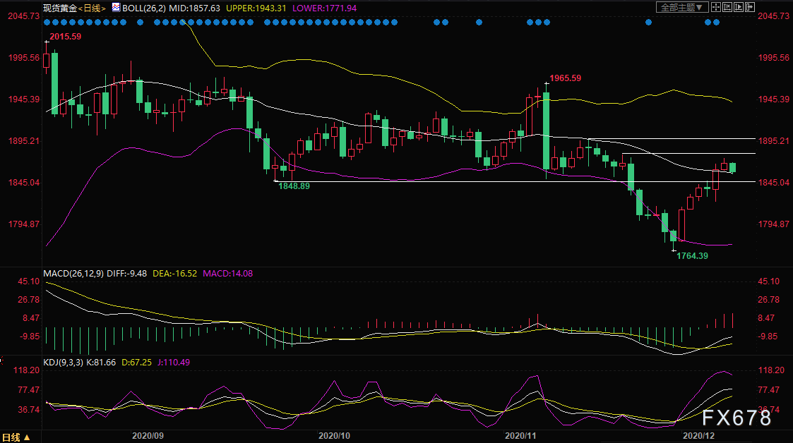 周三(12月9日)现货黄金小幅走弱,一度跌创两日新低至1855.79美元/盎司,一方面是美国股市创历史新高后打压了黄金的避险需求,另一方面,上一交易日金价受阻于50日均线附近的关键阻力后,部分多头获利了结。但是,由于海外新冠肺炎的确诊病例仍在持续升高,市场对美国出台更多财政刺激政策的预期不变,在金价回落至20日均线1844.42下方前,金价后市仍留有震荡走高的机会。