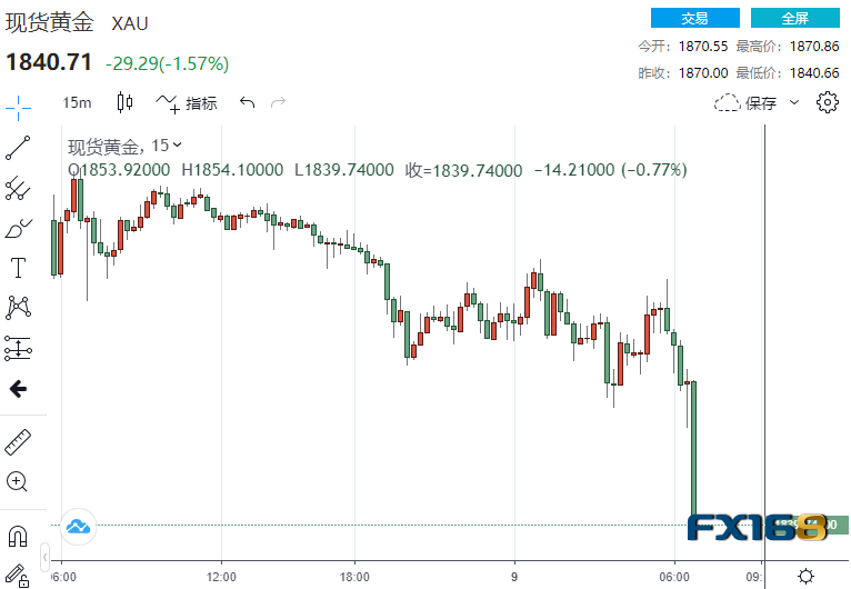 美市早盘,现货黄金下跌近1.6%,刷新日低至1840.66美元/盎司,较日高跌去30美元。