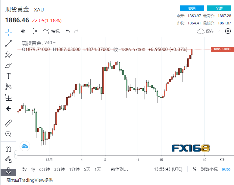 在美元下挫之际,欧元、英镑大幅拉升,尤其是英镑一度突破1.36关口,最高1.3624;现货黄金也持续反弹,最高1887.28美元/盎司,进一步逼近1890关口。